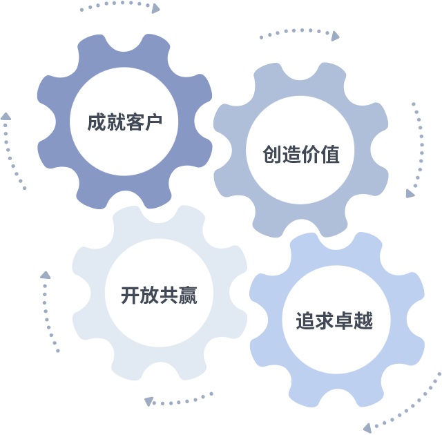 成就客户是一切决策的出发点,创造价值是衡量所有工作的标准,追求卓越是3522vip浦京集团做事做人的态度,开放共赢是3522vip浦京集团的格局也是最终的结果。价值观的齿轮环环相扣,推动着组织里的每个人不断向前。